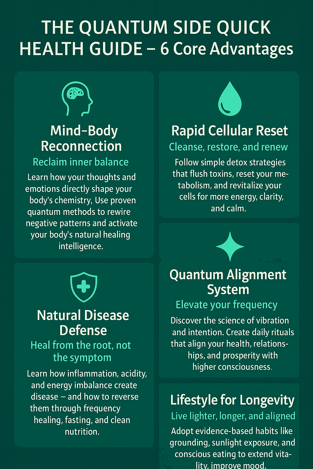 The Quantum Side Quick Health Guide isn’t just another wellness book — it’s your shortcut to total body balance, renewed energy, and radiant vitality.